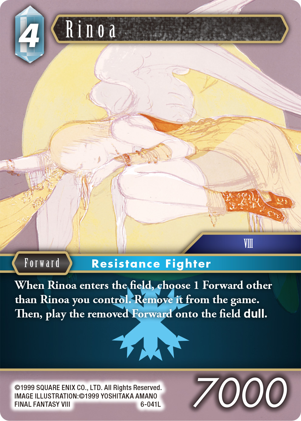 This ability should be easy to leverage since not only can the three category VIII cards you remove be summons or monsters, but also because Journey of Discovery includes several Category VIII cards. Keeping control of the Forward you select does cost extra CP, but declining to pay simply puts the card into the Break Zone, which means you can still take it off the field. Naturally, since you’ll have gained control, you can take advantage of any auto-abilities the card has that trigger upon entering the Break Zone. Ultimecia has great synergy with other Category VIII cards, such as [6-041L] Rinoa. Be sure to put her in your deck if you already have Rinoa.