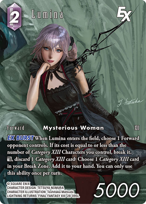 Let's take a look at Lumina [28-095L]'s stats. Lumina is a Forward with a cost of 2 and a power of 5000. But even so, she's got an auto-ability that can break Forwards with its EX Burst effect, as well as an action ability that can claim a card from the Break Zone.